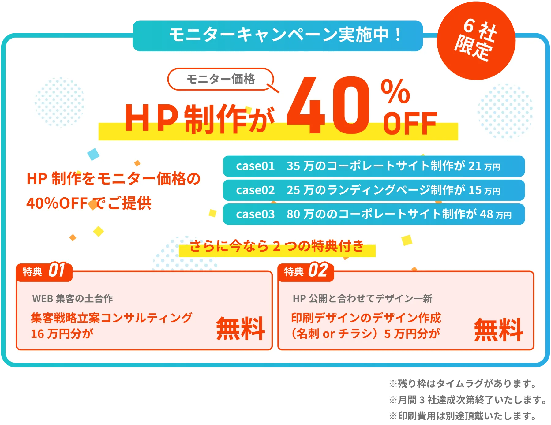 ご希望のプランや予算によって違いますが、当社ではデザイン制作前に競合調査やニーズリサーチを行い、集客導線やページ設計をした上でデザインを制作します。そのためただ単にデザインされたホームページと比べて成果に繋がりやすいです。